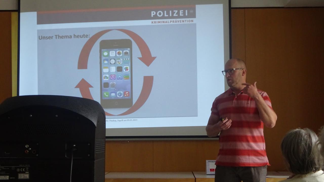 Vortrag eines Polizisten als Prävention für Telefonbetrug im Mai 2024